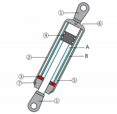 Gas tension springs are constructed similarly to gas compression springs. In these cases, however, the piston rod is in the interior of the cylinder, initially in an unloaded position. When the piston rod is placed under tensile load and the piston is pulled outward, the gas, e.g. nitrogen, in the chambers (A and B) is compressed. The compressed gas attempts to regain its original volume and pushes the piston back into its original position.