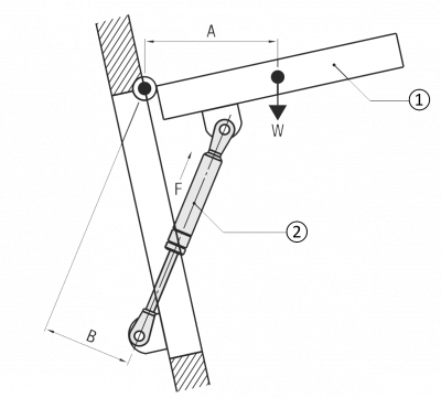 - B = Vertical distance between the hinge and the mounting point of the gas compression spring