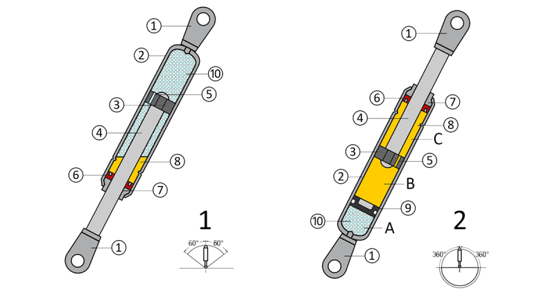 - Gas compression springs with floating piston: Gas compression springs with floating piston have a special construction with two cylinders. The floating piston separates gas and oil from each other.