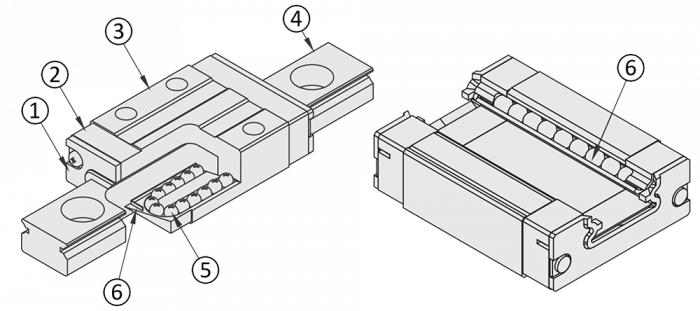 (1) Side seal, (2) Plastic recirculation unit, (3) Carriage, (4) Linear guide rail, (5) Ball, (6) Ball cage (wire)