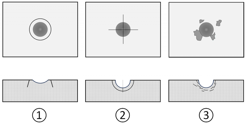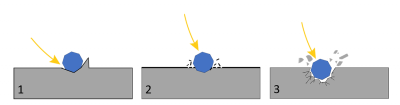 On brittle materials, various fracture modes can result depending on the material structure, shape and impact energy of the impacting particle and different impact angles: